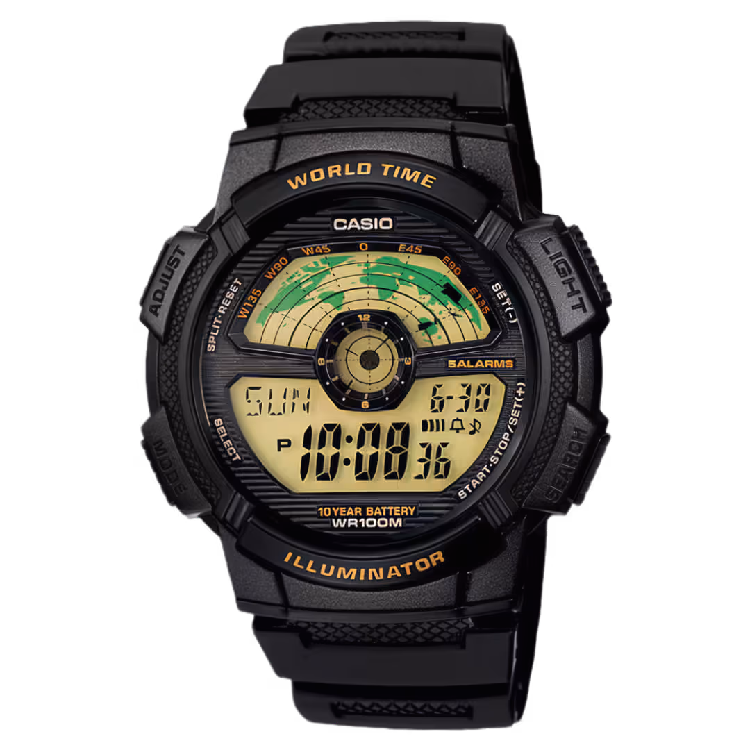 Casio AE-1100W-1B Timeless black polymer round digital watch with gold-tinted display