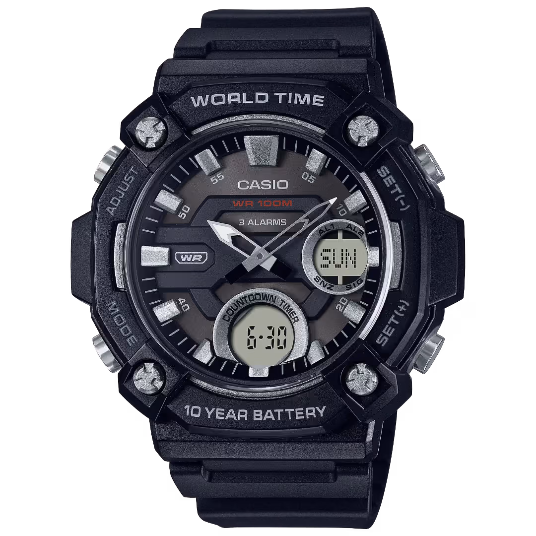 Casio AEQ-120W-1A black polymer men's sport ana-digi watch with a round case and black dial.