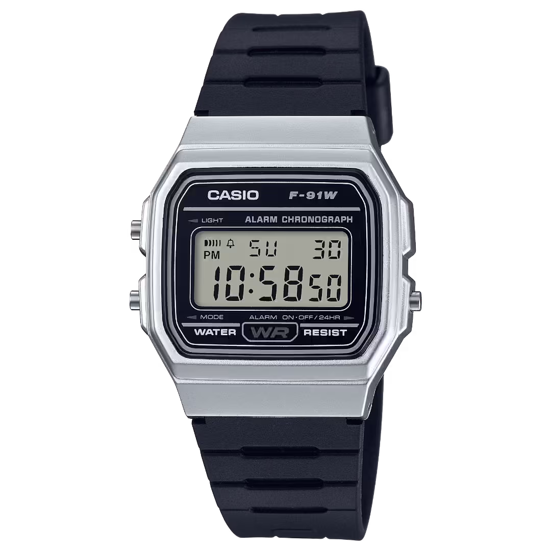 Casio F-91WM-7A silver rectangular polymer case, black resin strap, digital dial, vintage unisex watch