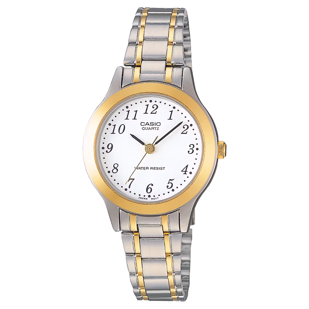 Casio LTP-1128G-7B women's round silver ion-plated brass case, gold bezel, white dial with Arabic numerals, two-tone silver and gold stainless steel bracelet watch