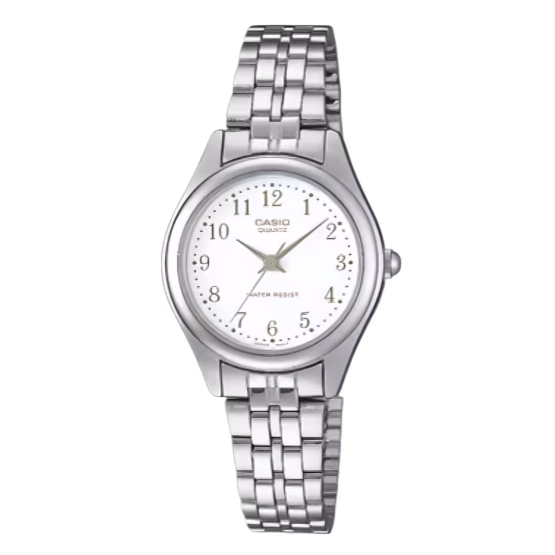 Casio LTP-1129A-7B Timeless women's silver-tone brass case, stainless steel bracelet, white dial classic analog watch