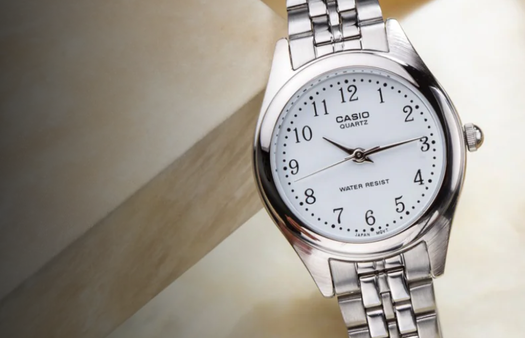 Casio LTP-1129A-7B resting against a textured stone block. The polished silver-tone case and white dial with crisp Arabic numerals create a clean, professional look under soft studio lighting.