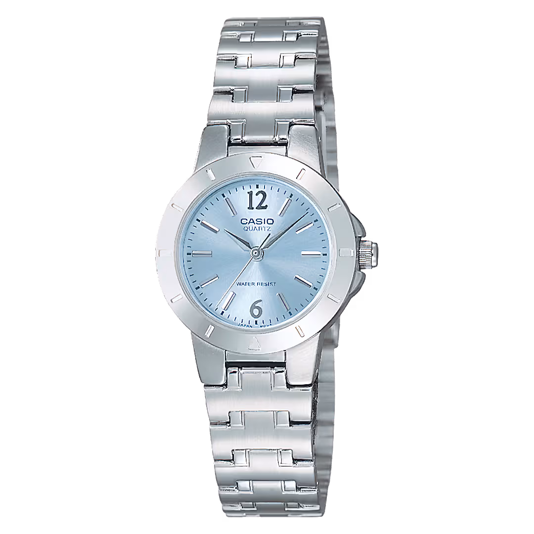 Casio LTP-1177A-2A Timeless Collection silver brass case, silver stainless steel bracelet, ice-blue sunburst dial women's analog quartz watch