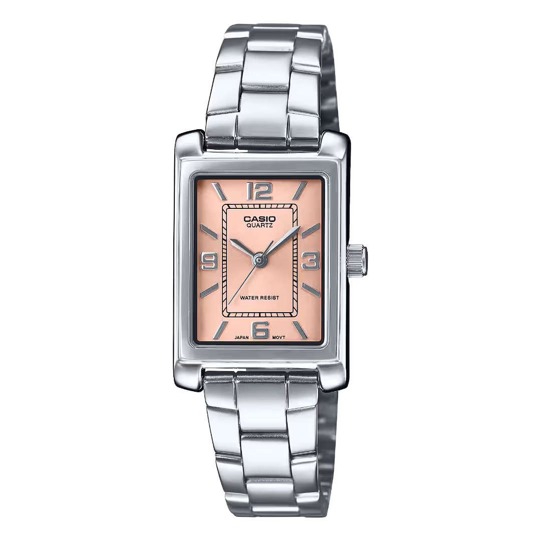 Casio LTP-1234DD-4A Timeless women's rectangular silver brass case salmon pink dial stainless steel bracelet analog watch.