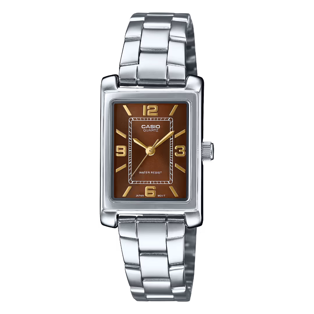 Casio LTP-1234DD-5A women's Timeless classic rectangular silver-tone stainless steel bracelet watch with chocolate brown sunburst dial