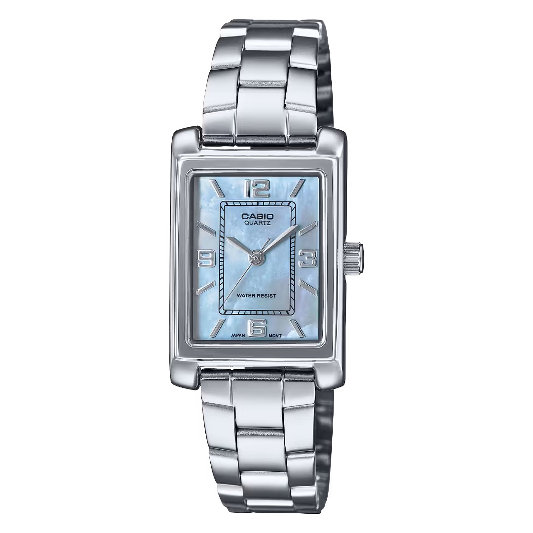 Casio LTP-1234DS-2A Timeless women's classic silver brass and stainless steel ice-blue mother-of-pearl rectangular analog quartz watch