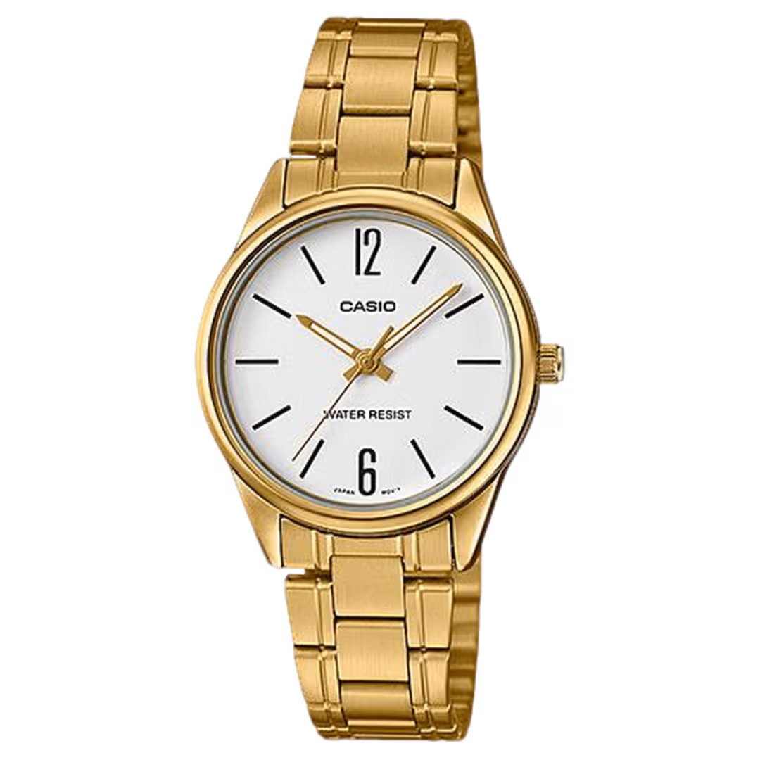 casio LTP-V002G-7B2 Timeless gold-tone stainless steel women's analog quartz watch with white dial and date window