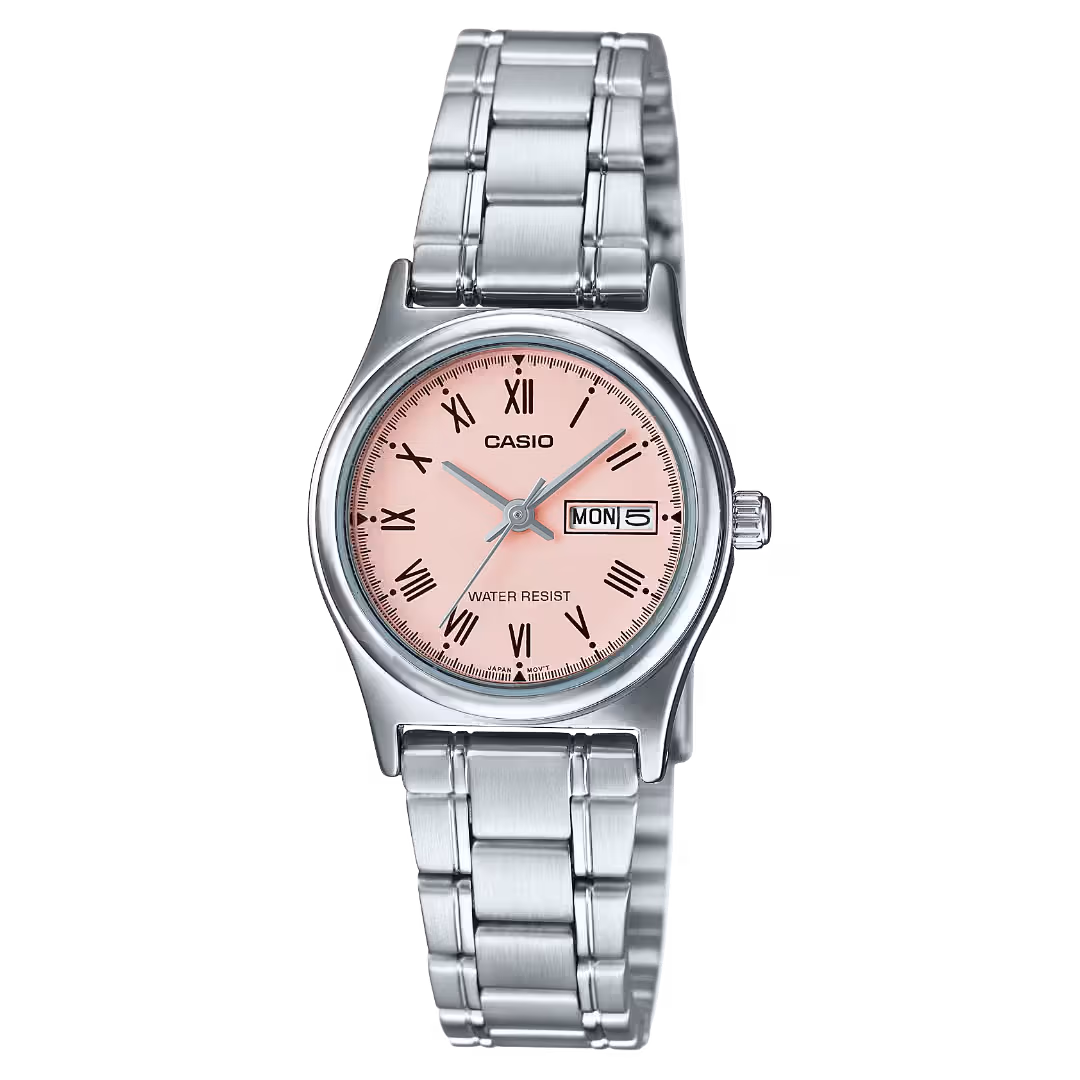 Casio LTP-V006D-4B Timeless silver brass and stainless-steel women's analog quartz watch with a salmon pink dial, Roman numerals, and day-date window.