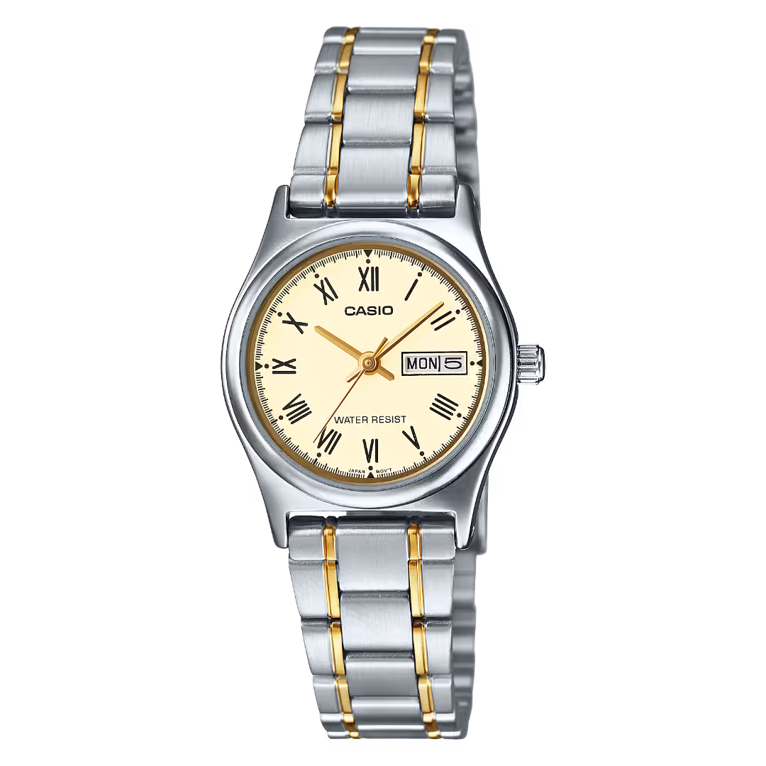 Casio LTP-V006SG-9B Timeless Collection two-tone silver and gold stainless steel women's classic analog watch with champagne dial, Roman numerals, and day-date window.