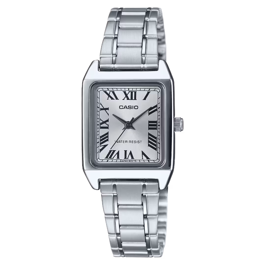 Casio LTP-V007D-7B Timeless women's silver rectangular chrome-plated brass case, stainless steel bracelet, silver sunburst dial with Roman numerals watch