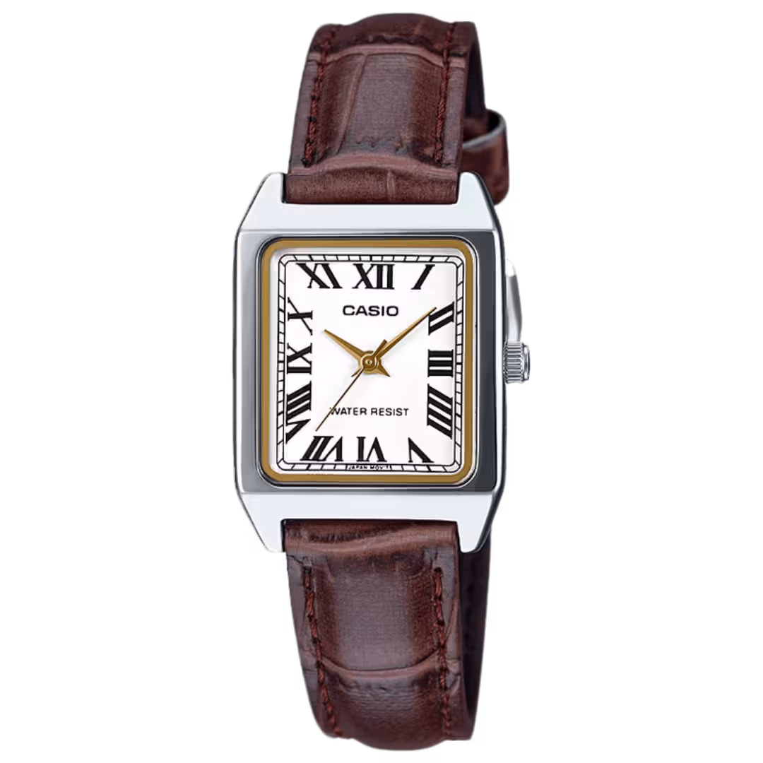 Casio LTP-V007L-7B2 Timeless women's classic rectangular silver brass case gold bezel white dial brown leather strap analog watch