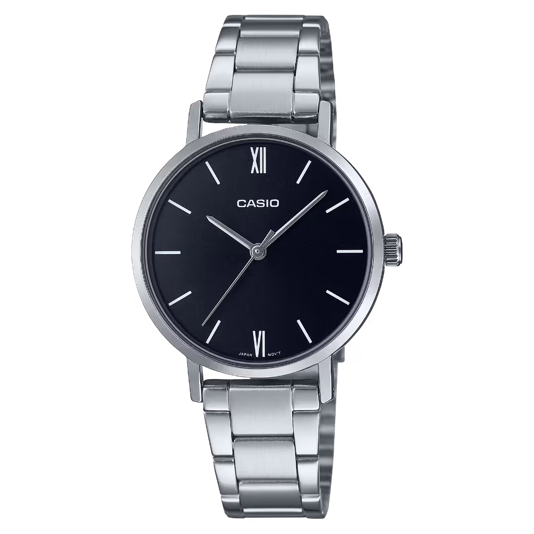 Casio LTP-VT01D-1B women's classic silver round chrome-plated brass case, silver stainless steel bracelet, black dial with Roman numerals and indices, quartz watch.