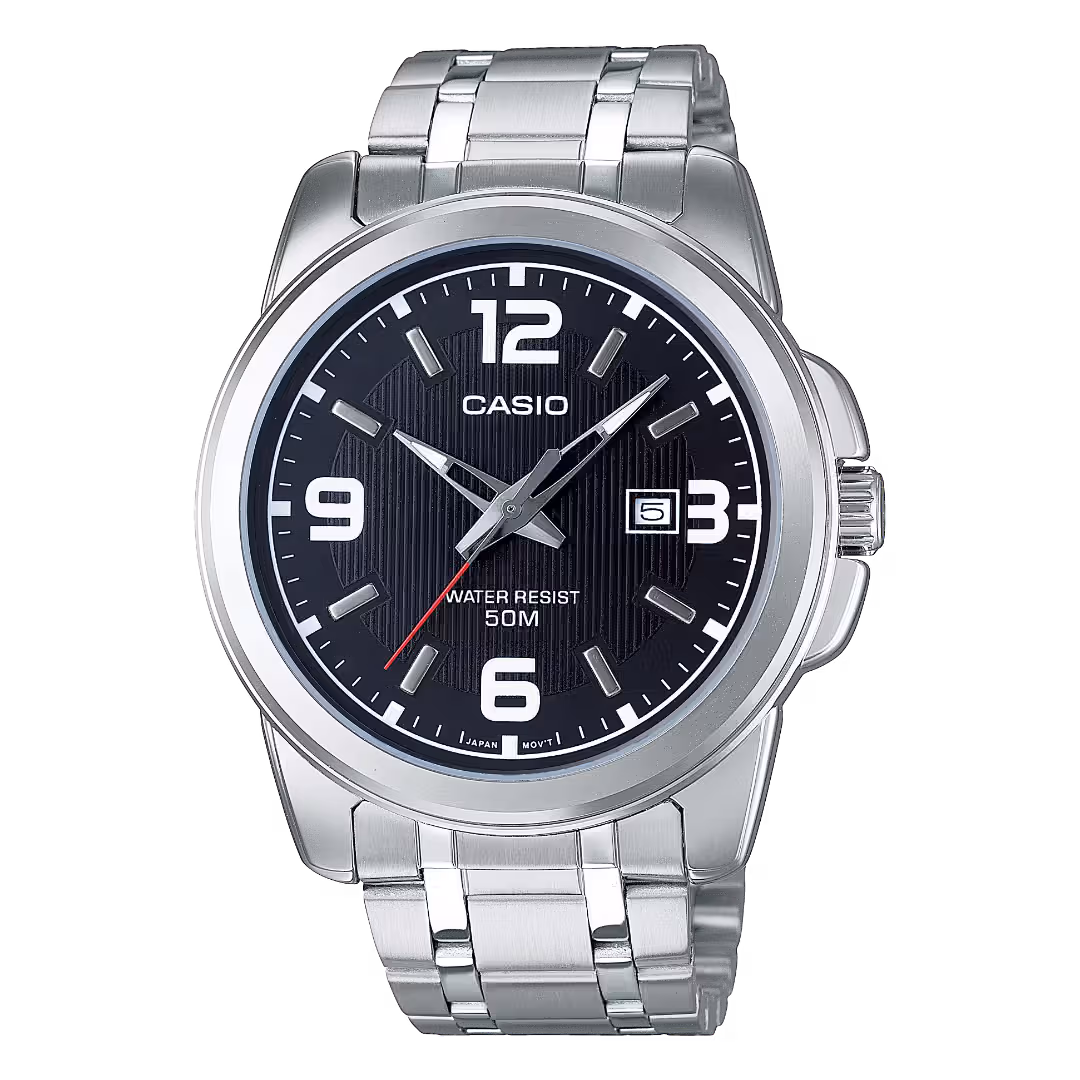 Casio MTP-1302D-1A1 Timeless silver ion-plated brass case, silver stainless steel bracelet, black sunburst dial men's analog quartz watch