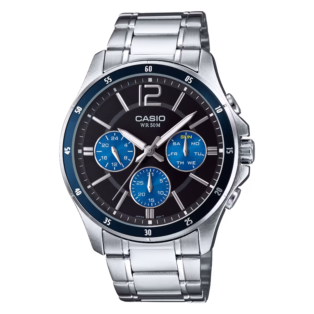 Casio MTP-1374D-2A Timeless Collection silver-tone brass case, navy blue bezel, royal-blue dial, silver stainless steel bracelet classic analog watch