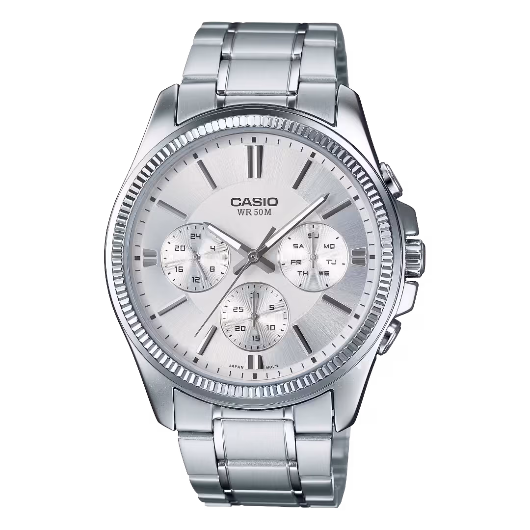 Casio MTP-1374D-7A Timeless men's classic round watch with silver-toned brass case, stainless steel bracelet, black bezel, silver sunburst dial, and three subdials.