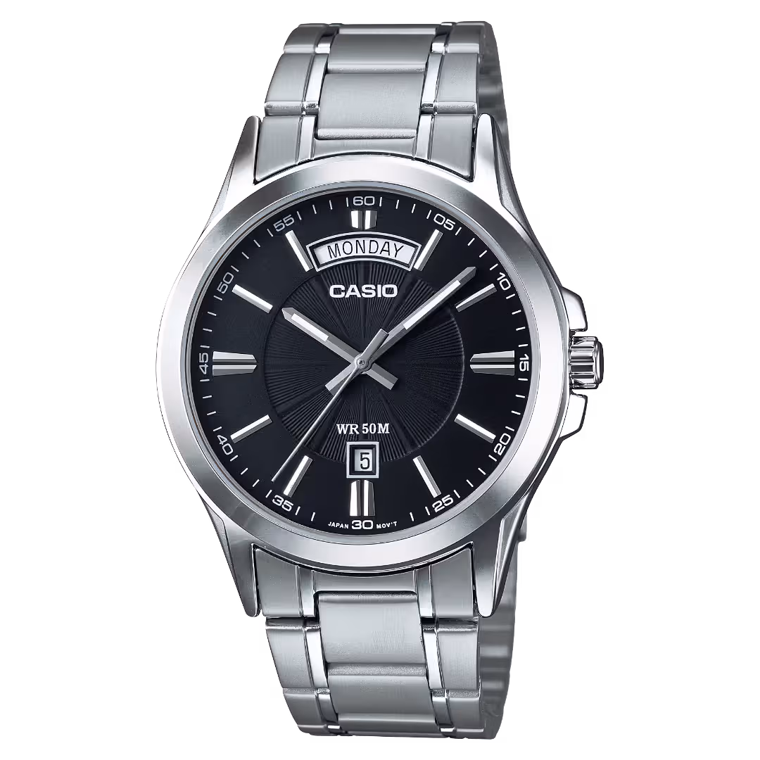 Casio MTP-1370D-1A2 Timeless silver stainless steel men's analog quartz watch with black dial and day-date window