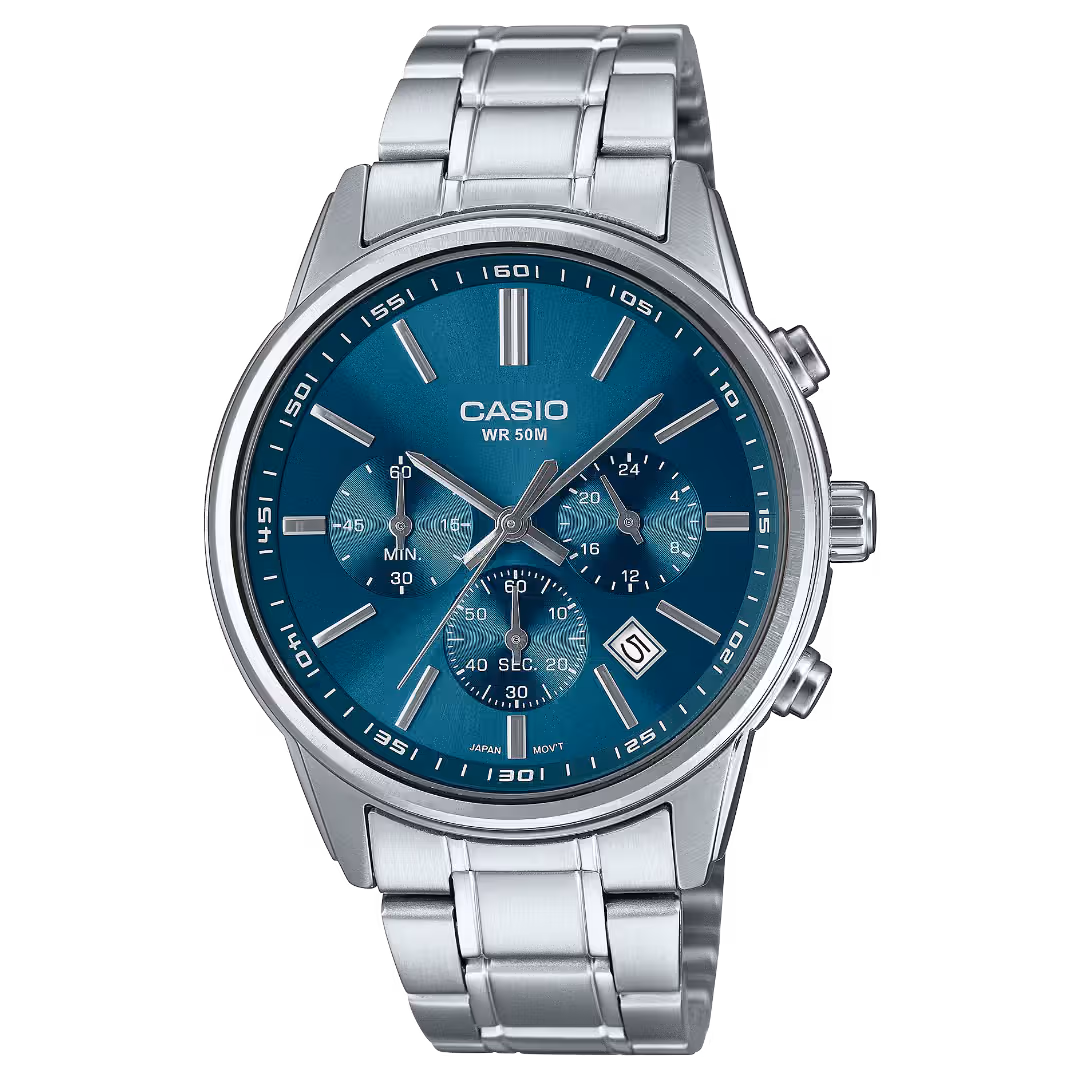 Casio MTP-E515D-2A1 Timeless men's classic silver stainless steel analog chronograph watch with teal blue sunburst dial and date window.
