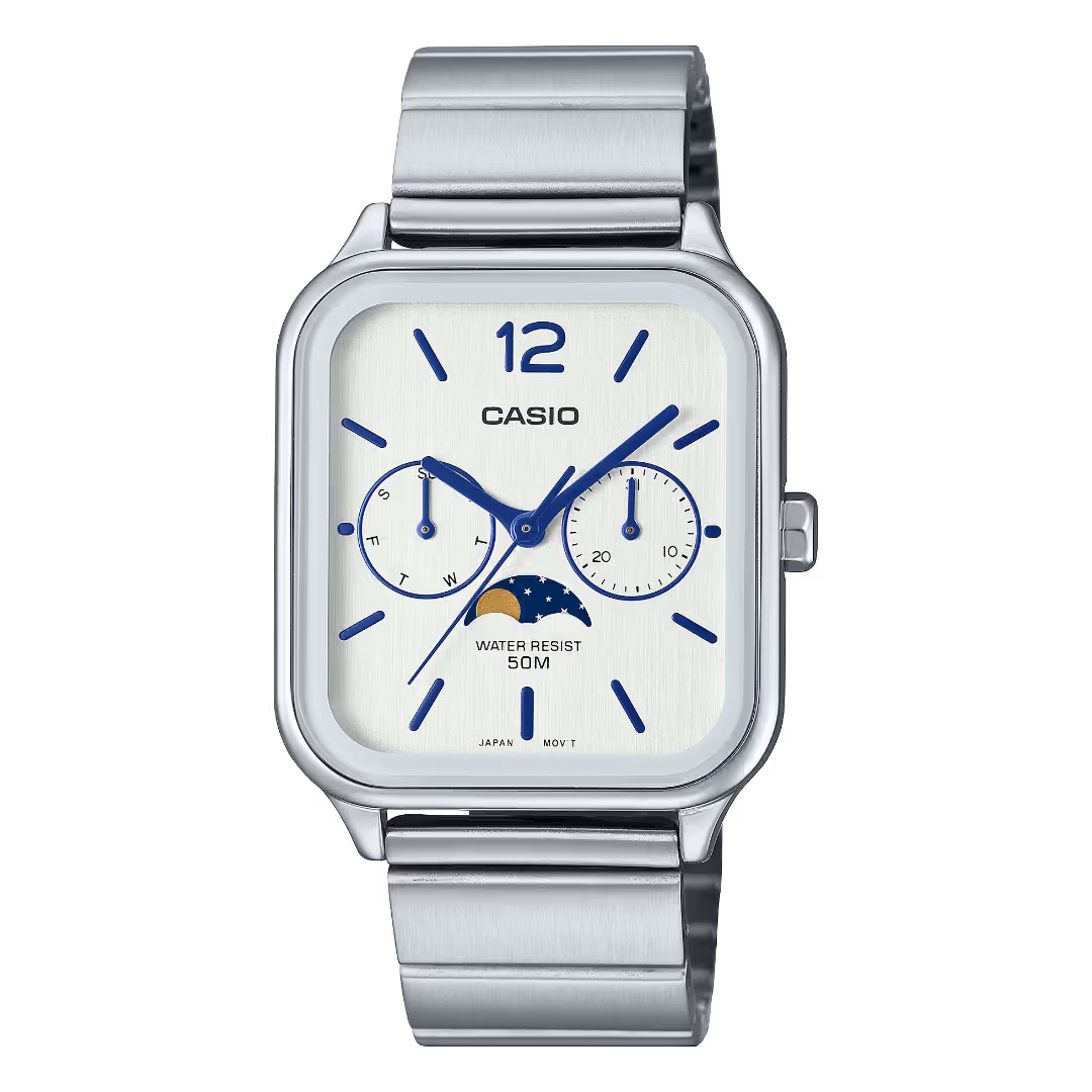 Casio MTP-M305D-2A Timeless Collection silver stainless steel men's rectangular watch with ice-blue dial, day-date subdials, and moon phase