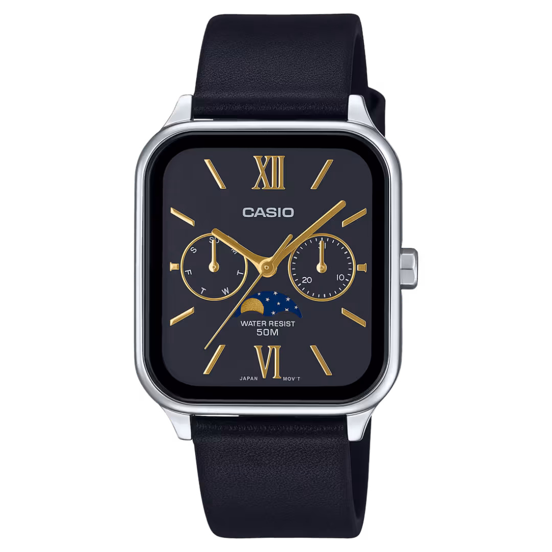 Casio MTP-M305L-1A2 Timeless silver stainless steel men's rectangular analog watch with black leather strap, black dial, day-date subdials, moon phase, and Roman numerals.