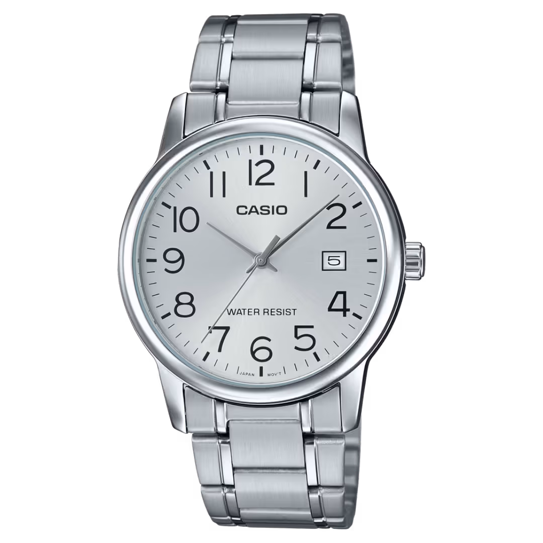 Casio MTP-V002D-7B Timeless silver stainless steel men's casual analog quartz watch with sunburst dial, Arabic numerals, and date window.