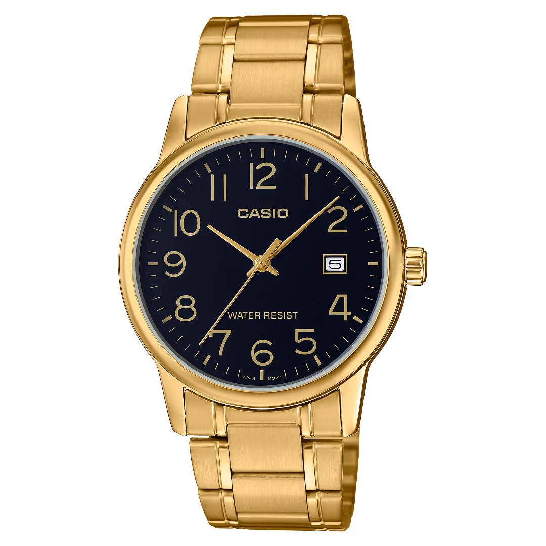 Casio MTP-V002G-1B Timeless men's gold ion-plated brass case and stainless steel bracelet analog quartz watch with black dial and date window.