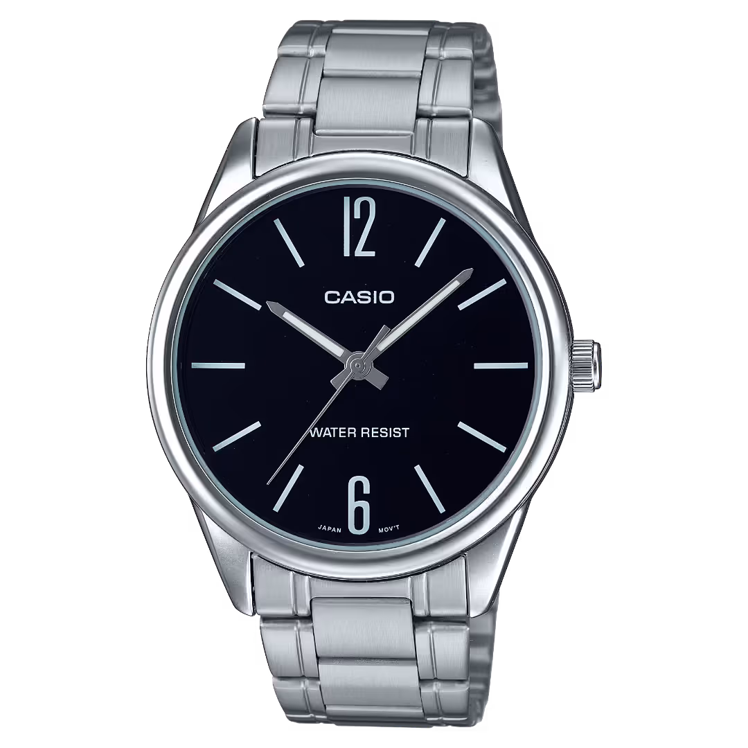Casio MTP-V005D-1B5 Timeless collection silver-tone chrome-plated brass case stainless steel bracelet black dial Roman numerals men's analog watch