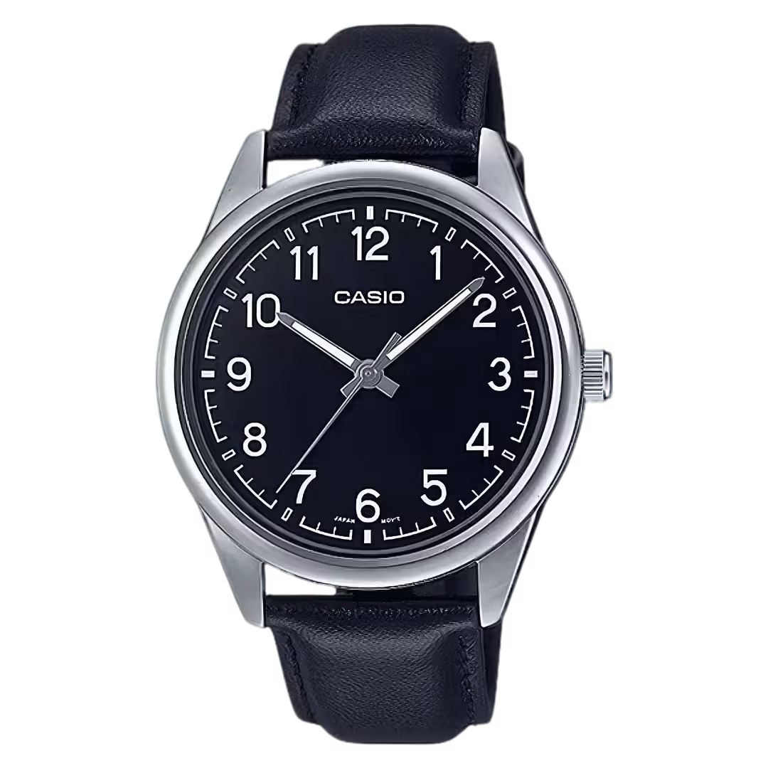 Casio MTP-V005L-1B4 Timeless black dial silver chrome-plated brass case black genuine leather strap men's analog watch