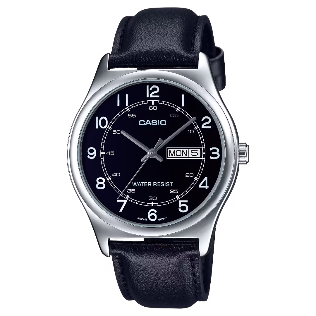 Casio MTP-V006L-1B2 Timeless silver brass case, black dial with day-date window, black leather strap men's analog quartz watch