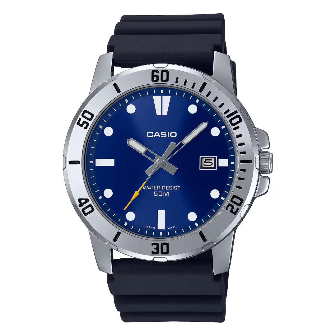 Casio MTP-VD01-2E Timeless silver brass case, navy blue sunburst dial, black polymer strap men's watch