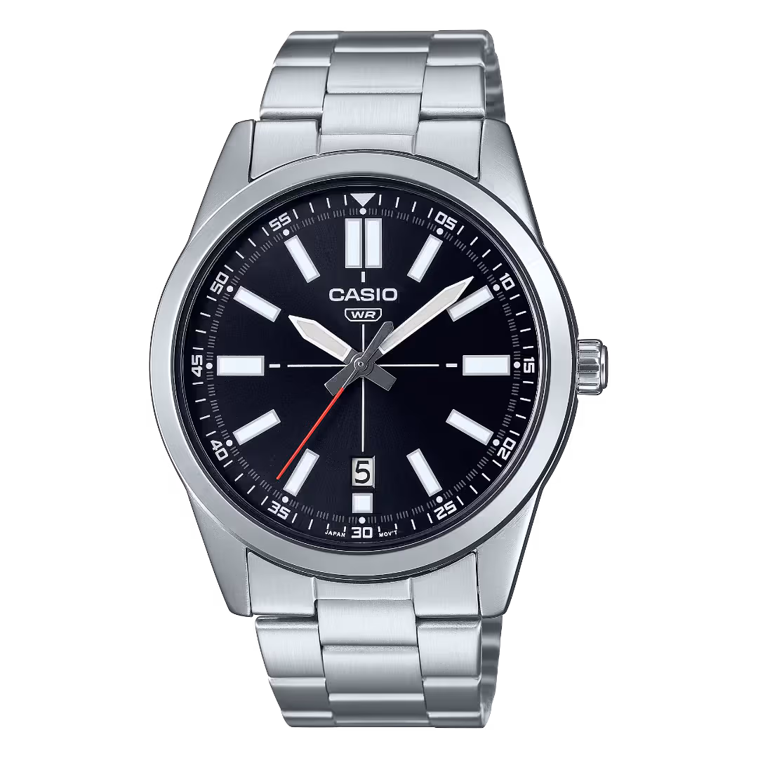 Casio MTP-VD02D-1E Timeless silver brass case and stainless steel bracelet, black dial men's analog quartz watch