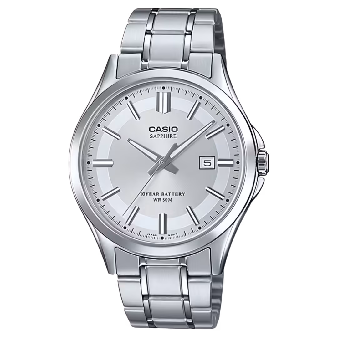 Casio MTS-110D-7A Timeless silver-tone stainless steel men's classic analog quartz watch with sunburst silver dial, date window, and sapphire glass.