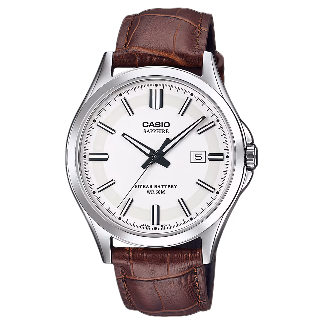 Casio MTS-100L-7A paired with a crisp white dress shirt. The polished steel case and brown embossed leather strap project a professional business aesthetic. Light reflects off the sapphire crystal and clean white dial face.