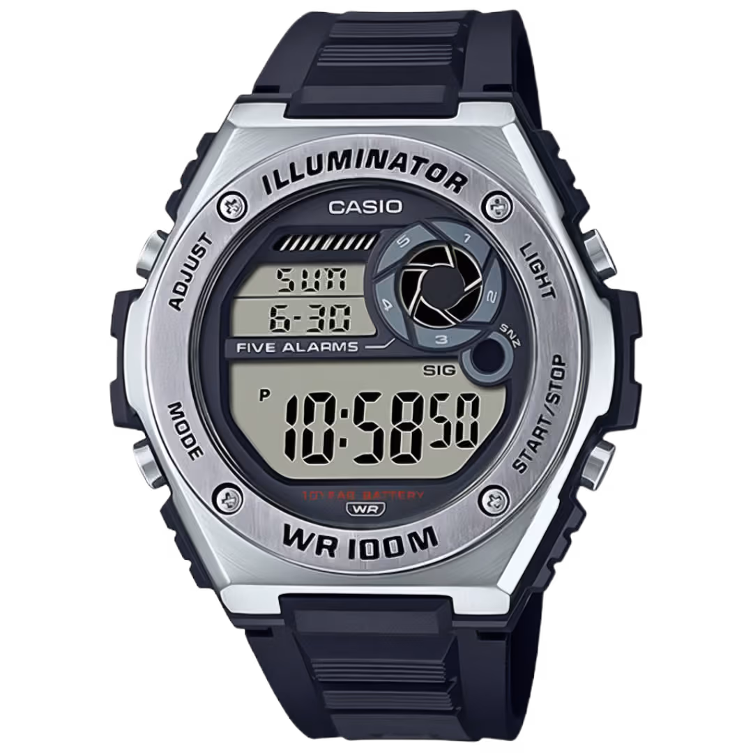 Casio MWD-100H-1A Timeless Collection black polymer and silver stainless-steel men's sport digital watch.