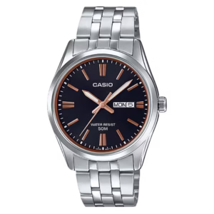 Casio MTP-1335D-1A2 men's silver stainless steel bracelet watch with black sunburst dial, sword hands, and day-date window.