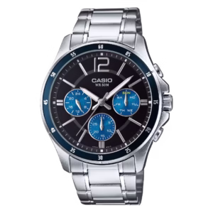 Casio MTP-1374D-2A Timeless Collection silver-tone brass case, navy blue bezel, royal-blue dial, silver stainless steel bracelet classic analog watch