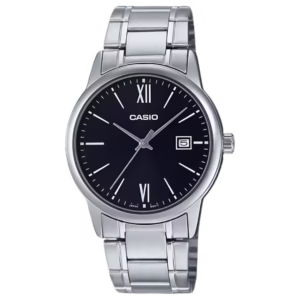 Casio MTP-V002D-1B3 Timeless Collection silver-tone brass case and stainless steel bracelet, black sunburst dial with Roman numerals and date window, men's analog quartz watch.
